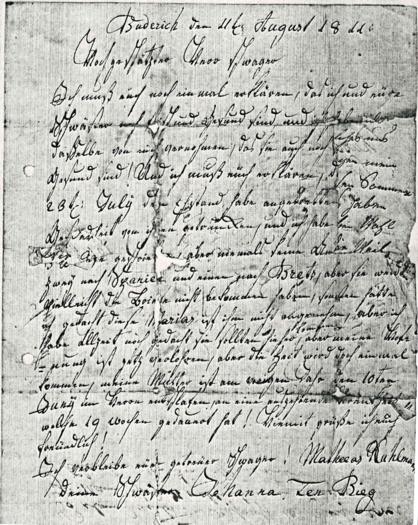Die Früchte ist sehr theuer die .... Rogen Brod kosten so viel wie vor Jahr ein Pfund Rohgen 26 - Stüber und alles nach Rato, wo wir Gott sey dank kein Mangel an haben, aber der Tabak ist sehr theuer absonderlich der Kafi, so ist mein Nahrung des Morgens ein 1/2 ort. Waßer wo etwas Rogen eingekocht ist. Wil dein Mutter mir noch entbehren, so ersuche ich wenn du schreibest da du dein Mutter ein kleine Erinnerung da über machest, aus meine seith.